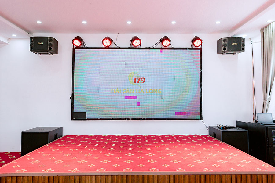 Nhà hàng Hải sản 179 được trang bị màn hình LED kích thước lớn tại cả ba sảnh, tạo nên không gian dùng bữa hiện đại và linh hoạt. Hệ thống màn hình giúp nhà hàng dễ dàng phục vụ các nhu cầu trình chiếu, giao lưu và giải trí nhẹ nhàng trong suốt bữa ăn, đồng thời nâng cao trải nghiệm cho các đoàn du lịch, đoàn công ty và nhóm khách đông.