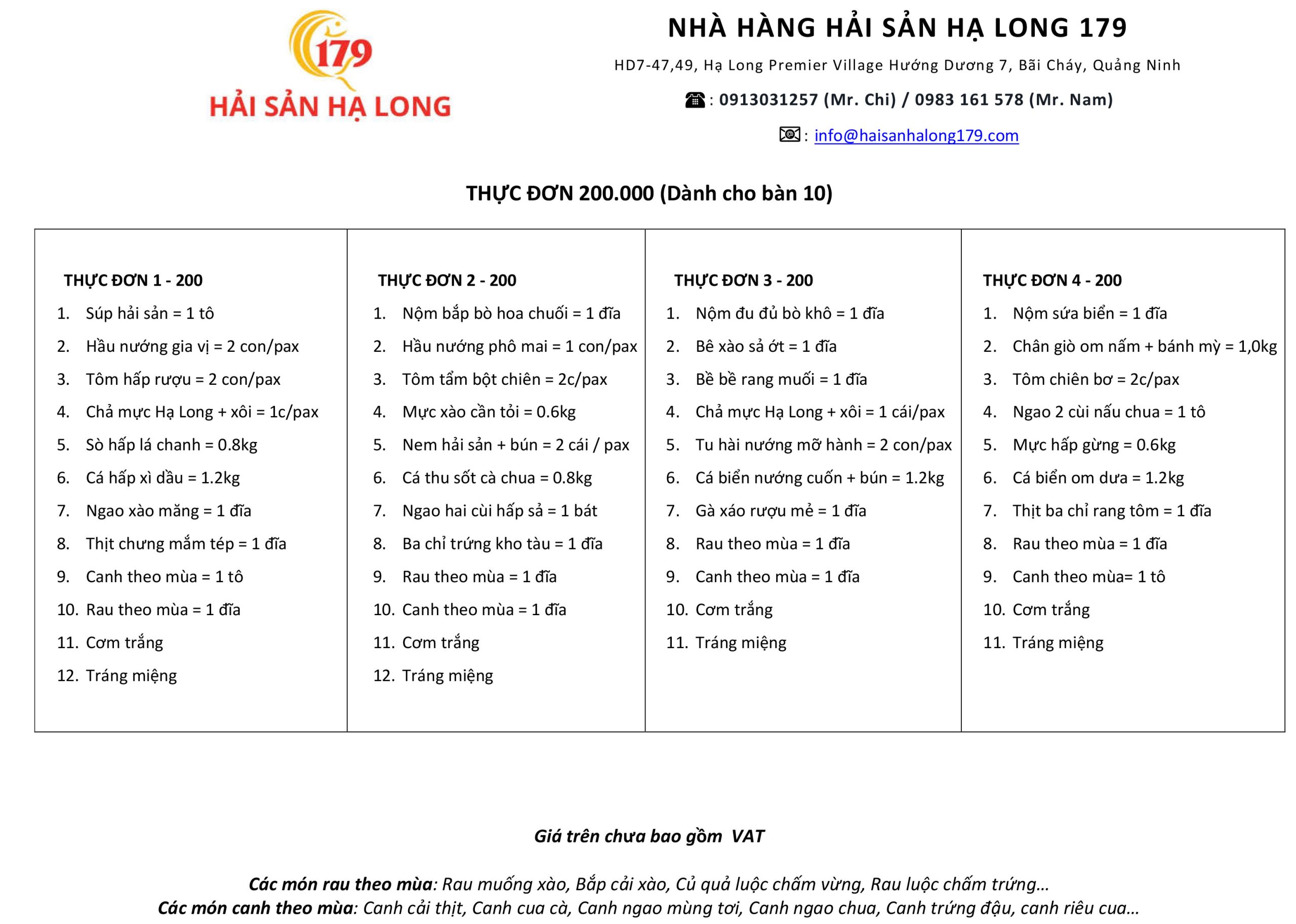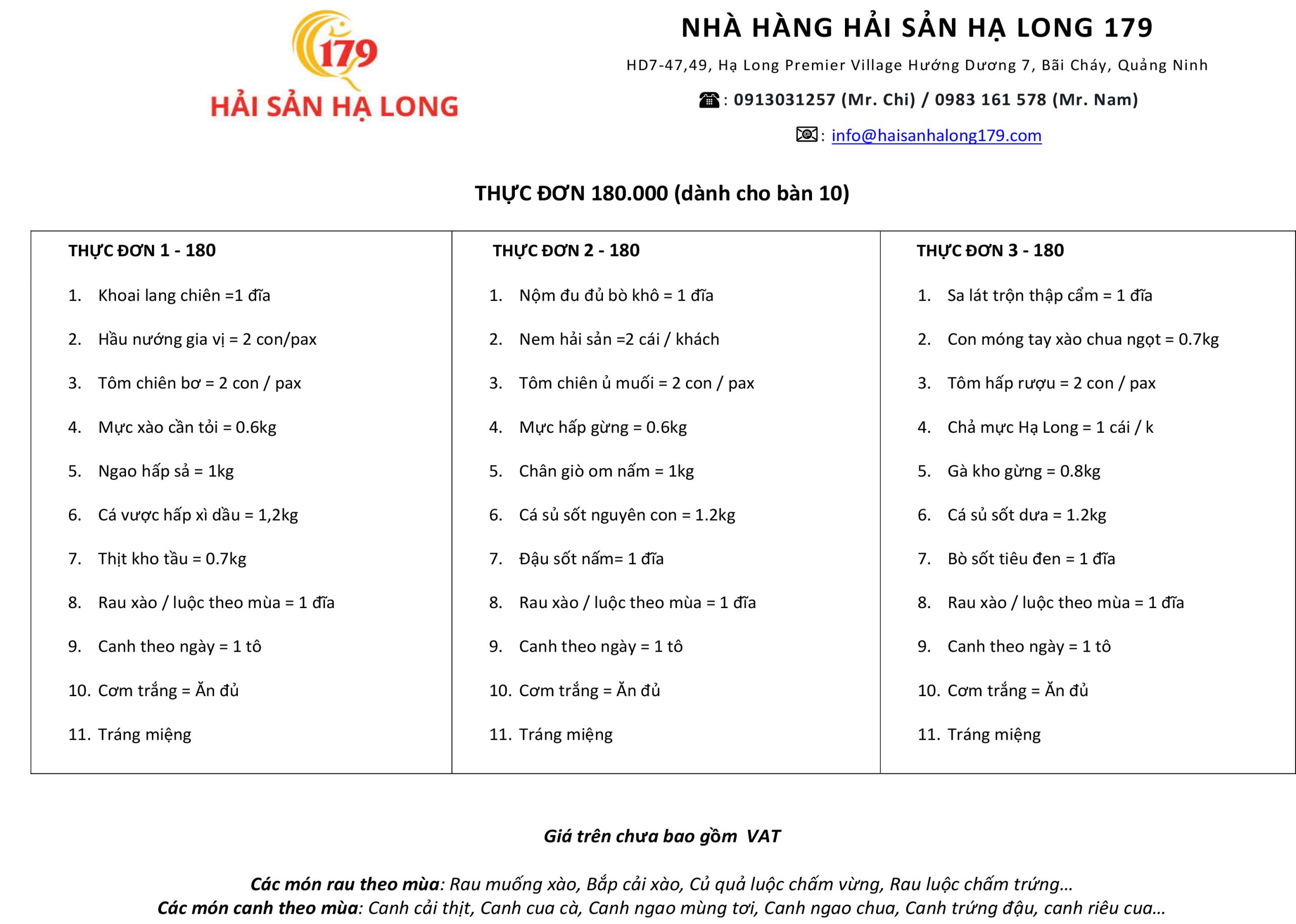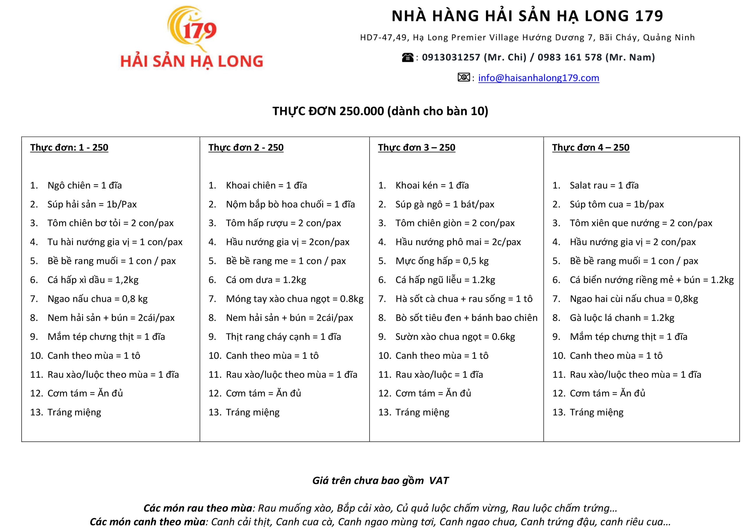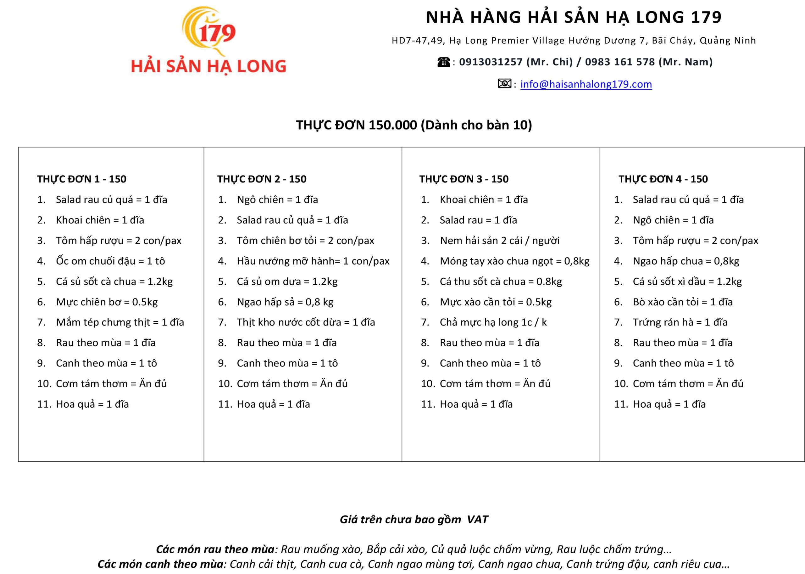 Nhà hàng Hải sản 179 xây dựng hệ thống menu dành riêng cho khách đoàn du lịch, nhằm đảm bảo việc phục vụ diễn ra đúng kế hoạch, đúng thời gian và đúng ngân sách đã cam kết với khách.